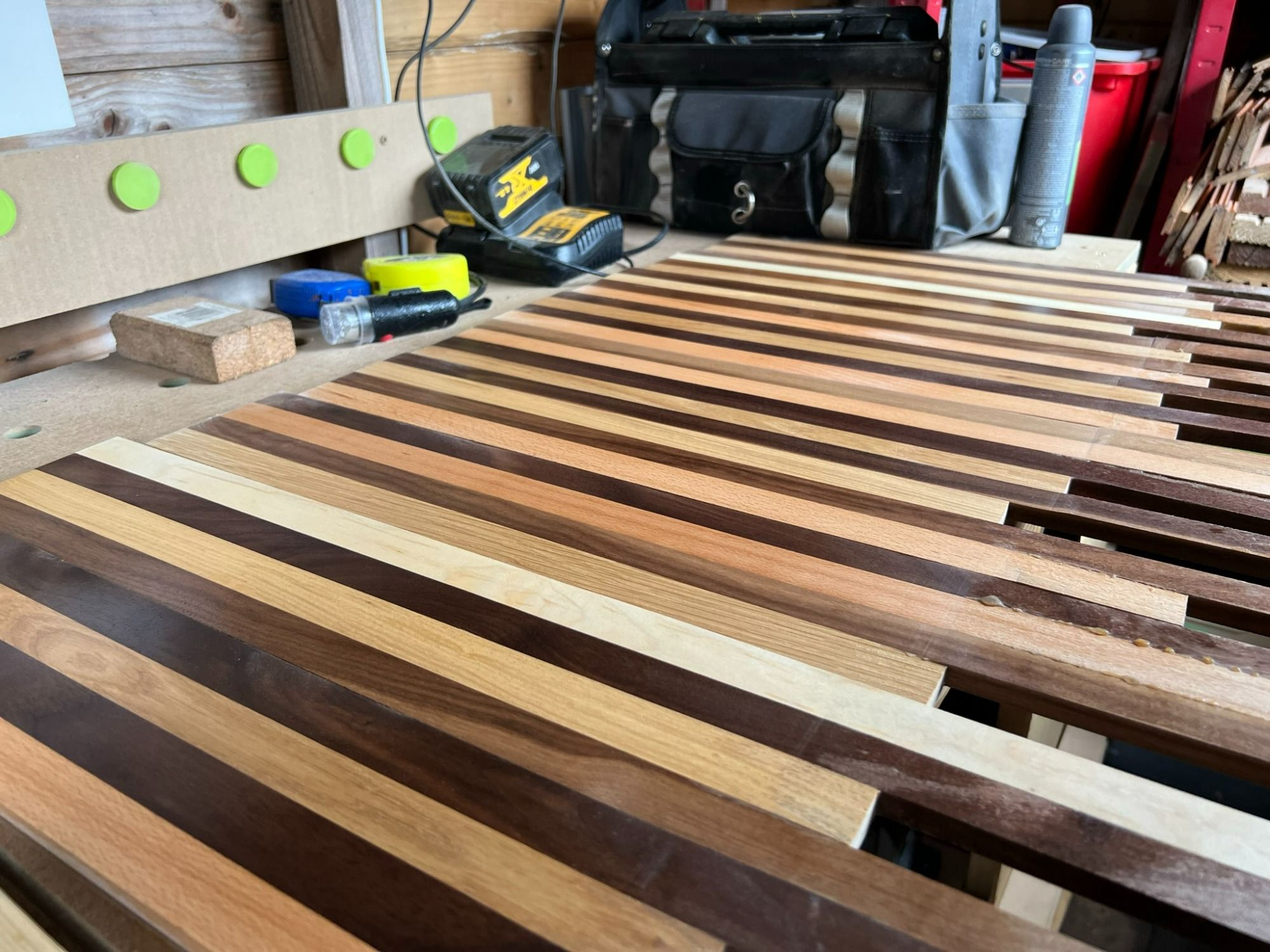 Taking the different slats and using the sash clamps made for lots of glue everywhere but I've been told to use plenty for a sturdy hold.