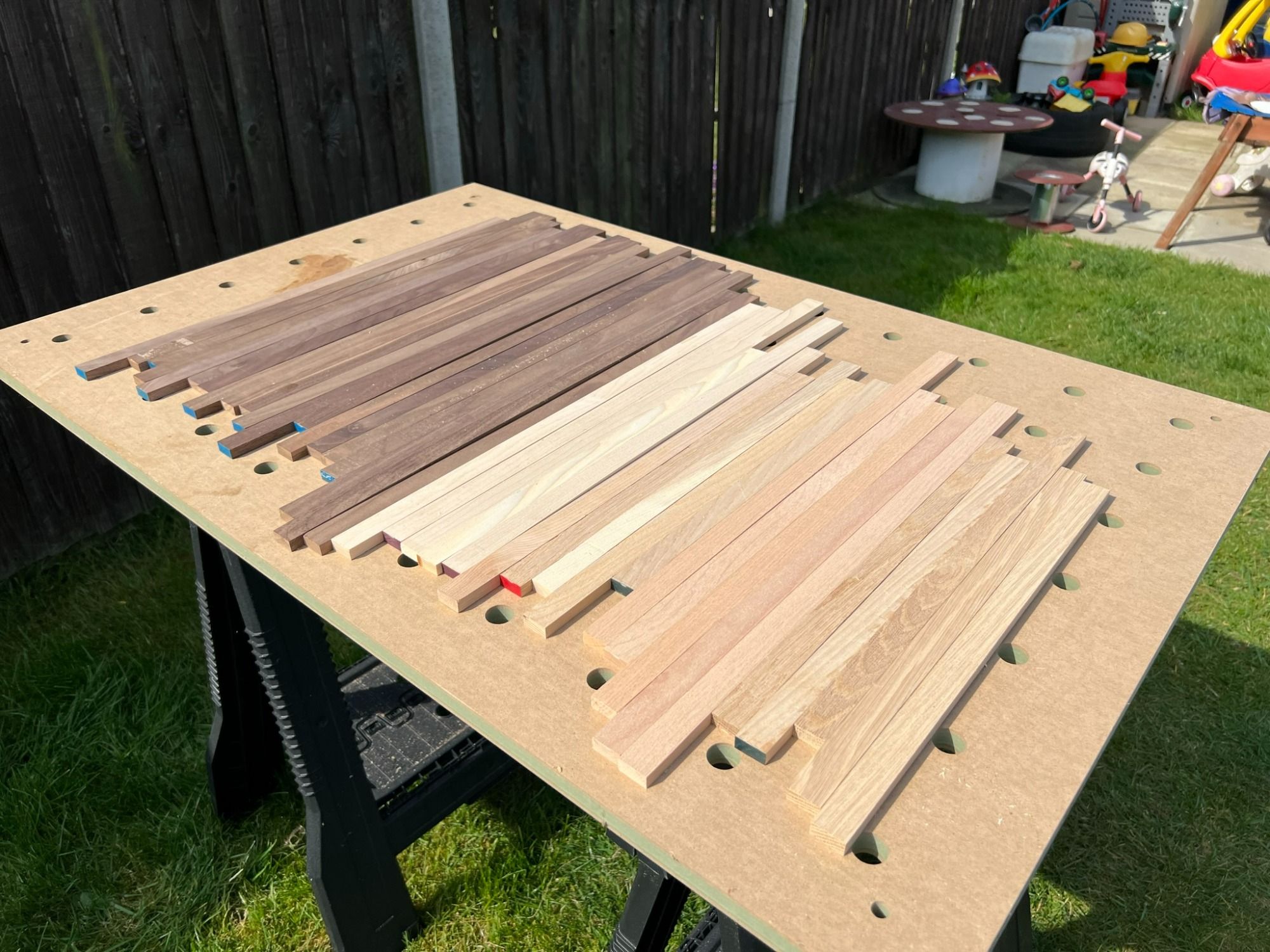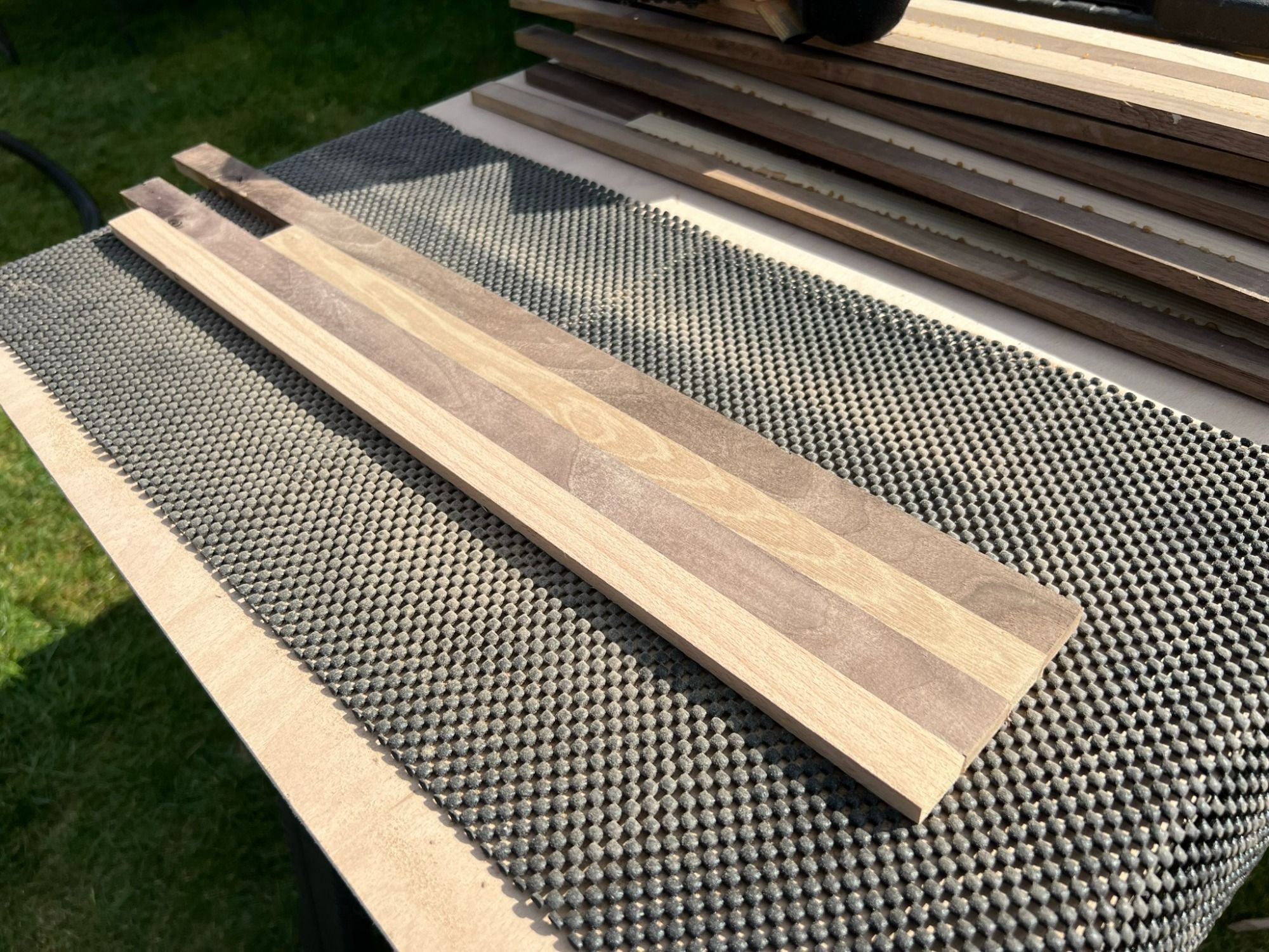 Setting the fence to 21 mm gave me uniform cuts to each of the slats. There were 40 wide wooden slats that I then trimmed to 80 smaller slats.
