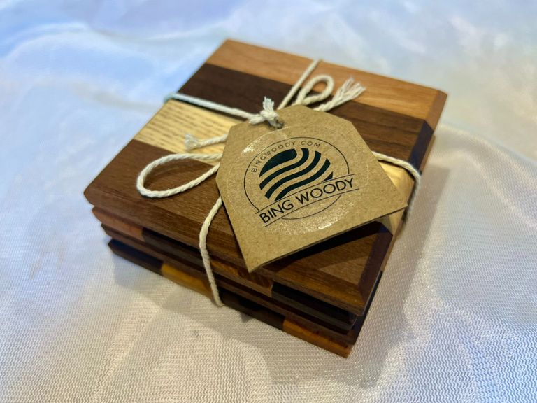 Add a bit of string, a recycled tag out of some packaging that was sent through, a sticker with my logo and VOILA! the coasters are complete.